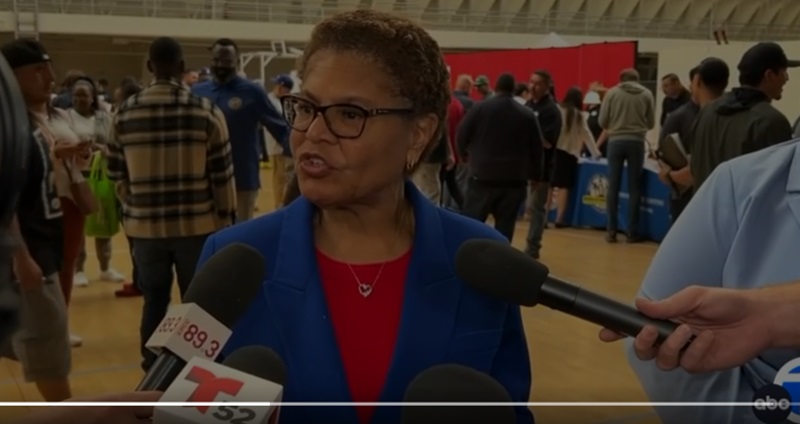 LA Mayor Karen Bass talks to reporters at the city’s fourth job fair on November 2. [Screen capture from ABC7 News]