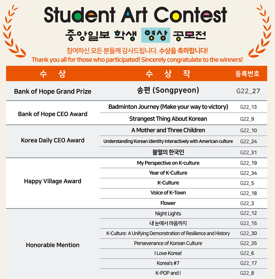 Thank you all for those who participated, and we would like to give a BIG congratulation to the winners of 2022 The Korea Daily Student Video Contest!