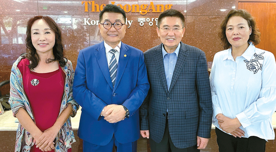 The Korean Food Global Association leaders promote the 2023 Korea Kimchi Festival scheduled for November 19 in Buena Park. Pictured from left are Ann Choi, Audit Committee Chair; Jong Taek Lim, President; Yong Sik Kim, Vice President; and Chong K. Lee, Secretary General. [Eunyoung Lee, The Korea Daily]
