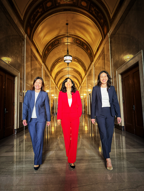 (From left) Jeanne Min, chief of staff to Councilmember Tim McOsker in the 15th District; Joanne Kim, chief of staff to Councilmember Marquis Harris-Dawson in the 8th District; and Hannah Lee, chief of staff to Councilmember John Lee in the 12th District. The three chiefs of staff walk down a hallway on the third floor of City Hall, home to the L.A. mayor’s office and the City Council. [Sangjin Kim, The Korea Daily]