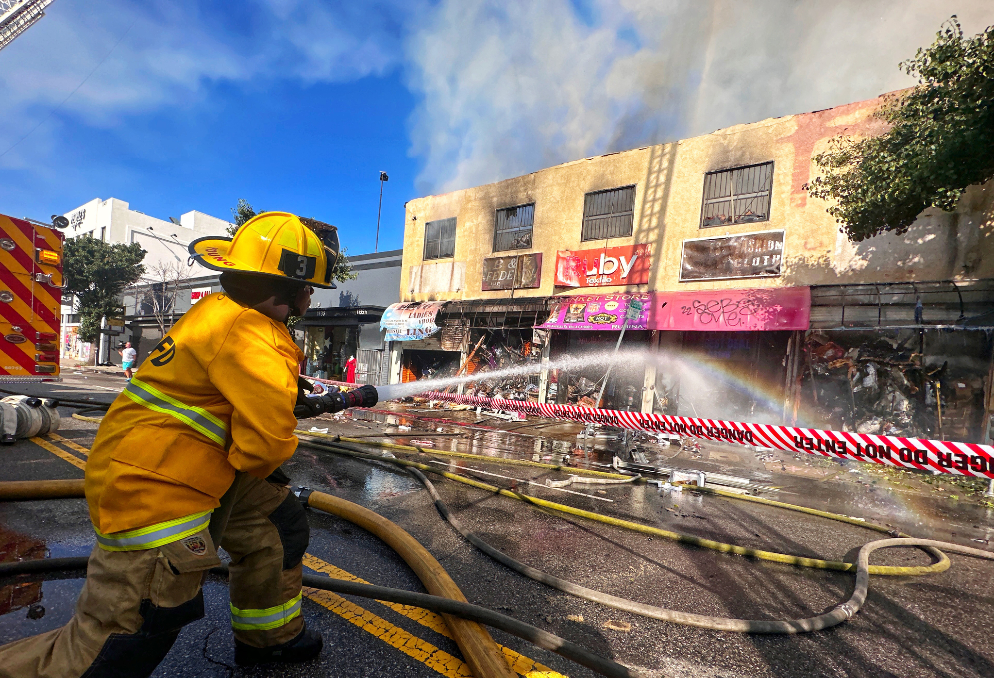 The Los Angeles Fire Department (LAFD) swiftly responded to the fire report, dispatching firefighters to a two-story commercial building located near the junction of South L.A. Street and 12th Avenue around 5:50 a.m. The establishment housed not only the blanket store owned by the elderly couple but also a jeans store and a kitchen appliance outlet. Tragically, the blaze consumed the entire structure, along with all three businesses it contained.