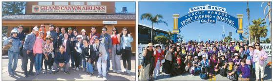 Left: South Korean tourists pose for a group photo in front of Grand Canyon Airlines on May 10. {Samho Tours] Right: A group of South Koreans pose for a photo before starting the Western tour program last month. [Aju Tours]
