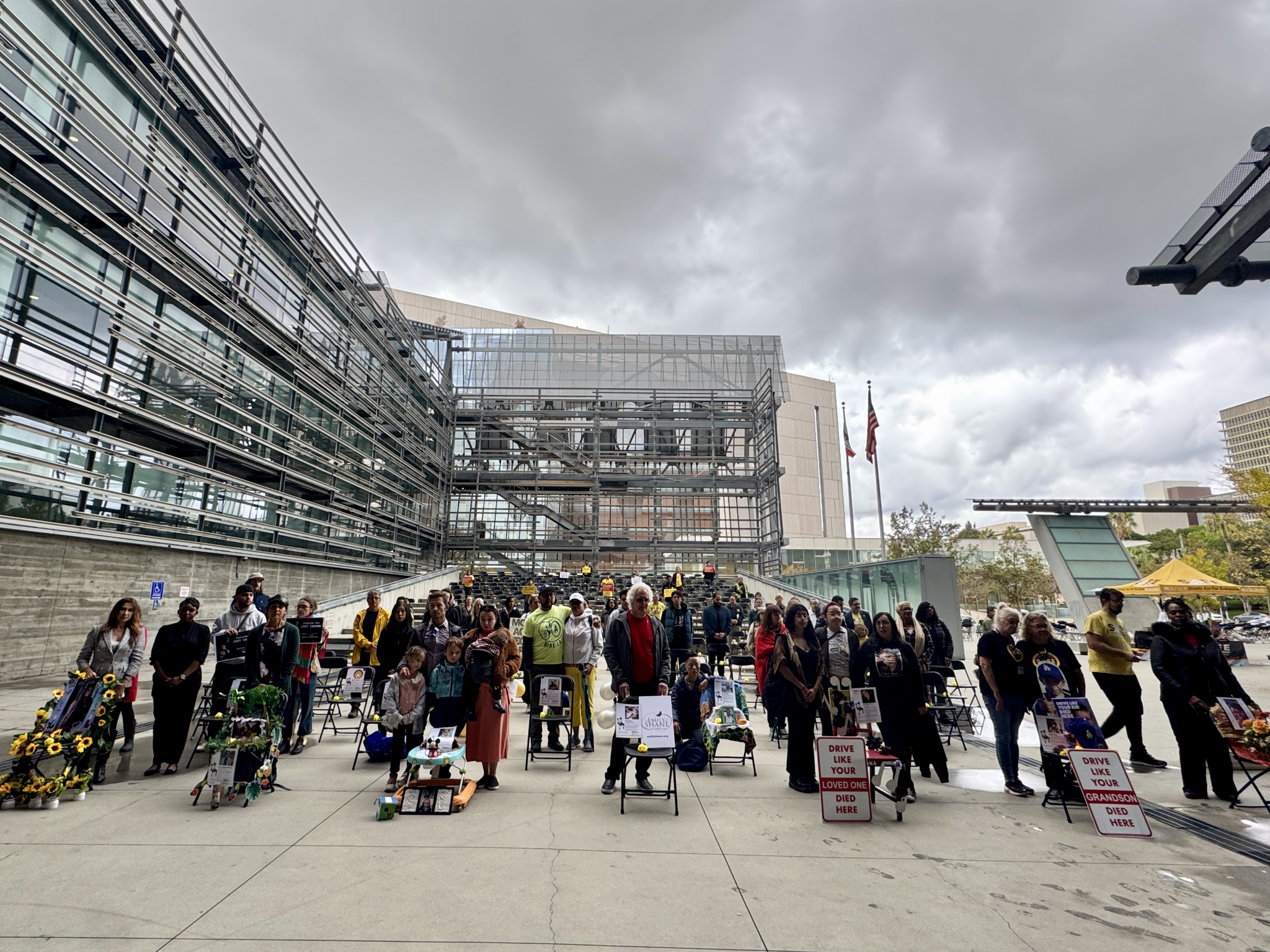 A new traffic safety campaign took center stage in downtown Los Angeles on November 16 as 711 empty chairs were unveiled to honor the 711 people who died in traffic collisions across Los Angeles County last year. Despite heavy rain, families and traffic-safety leaders gathered to mark the World Day of Remembrance for Road Traffic Victims. Each chair held a single yellow rose, symbolizing the absence left by every life lost.