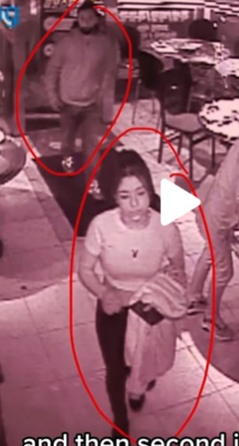 The video depicts a long-haired woman and a man with a mask covering his face entering the restaurant. While the woman goes to the bathroom, the man looks around, then leaves with a woman from the bathroom with a customer’s bag hung next to a table.