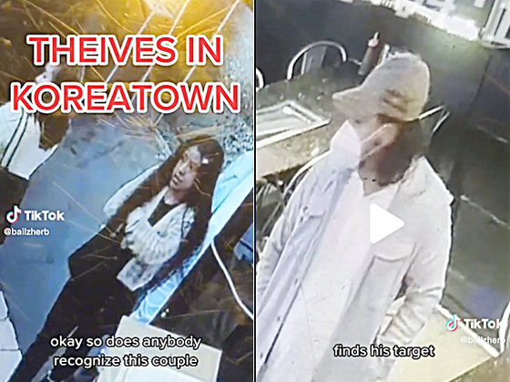 There is a male-female couple visiting Korean restaurants in LA Koreatown and engaging in a series of thefts against customers.