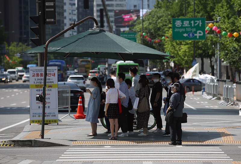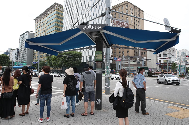 Pedestrians seek shelter from scorching heat under a parasol-shaped canopy in central Seoul, South Korea. [JoongAng Ilbo]