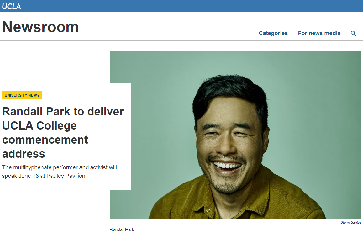 Actor, comedian and writer Randall Park will deliver the keynote address at all three UCLA College commencement ceremonies on June 16th, the school announced today.