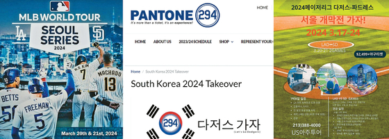From left: Posters for next year’s MLB Opening Day, set to be held in South Korea for the first time. The LA Dodgers fan club is inviting applications for an Opening Day tour. A promotional brochure from Aju Tours showcases their special motherland tour package.