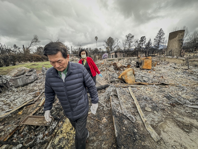 Kiseon Lee and Jeongja Yoo stand in devastation, surveying the remnants of their home, which was reduced to ashes by the Eaton Fire on February 6. A week after the fire, Yoo collapsed upon seeing what remained of their house. Now, however, the couple has come to terms with the loss, facing the aftermath with quiet resilience. [Sangjin Kim, The Korea Daily]