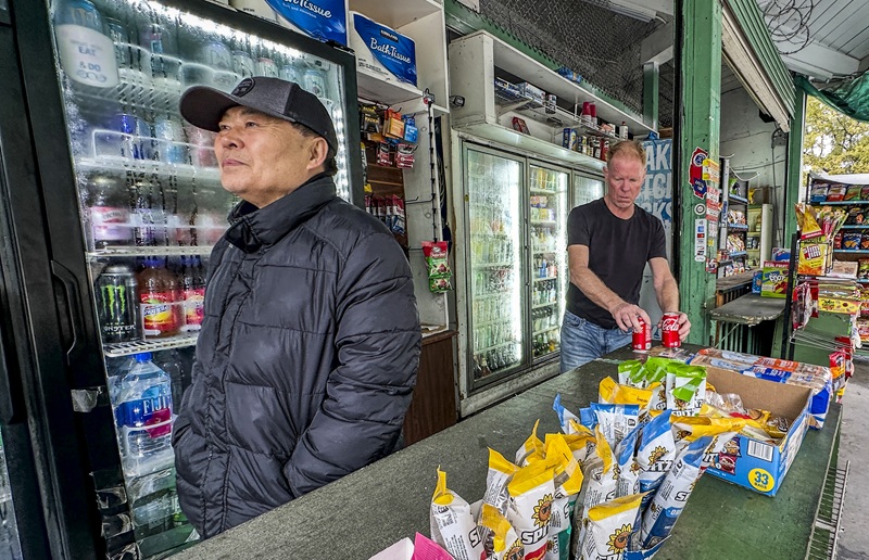 On February 6, Jungguk Oh (left), a manager at Altadena Dairy, stands in contemplation, noting the decline in customer traffic in the wake of the Eaton Fire. [Sangjin Kim, The Korea Daily]