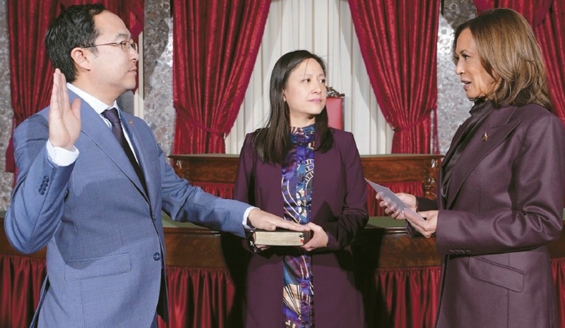On November 9, U.S. Senator Andy Kim (left) takes the oath of office before Senate President Kamala Harris. In the center is Kim’s wife, Kammy Kim. [Photo courtesy of Andy Kim’s office]