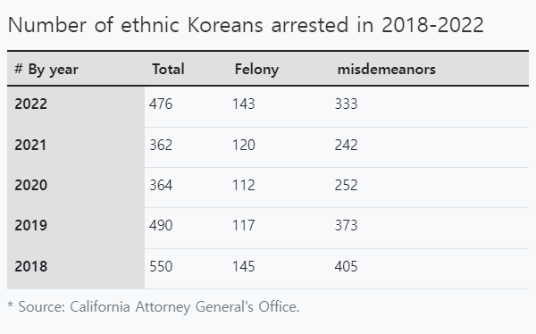 According to the statistics, the number of Korean arrests reached 898 (194 felonies and 704 misdemeanors) in 2015 and 550 (145 felonies and 405 misdemeanors) in 2018, but dropped to 490 in 2019, 364 in 2020, and 362 in 2021. However, following the end of the COVID-19 pandemic, the number of arrests rebounded.