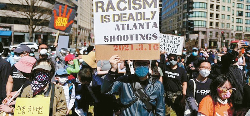 Participants march with signs bearing slogans such as “Stop Asian Hate” and “Reject Racism” during a protest near the White House in Washington on March 21, 2021. [Reuters]