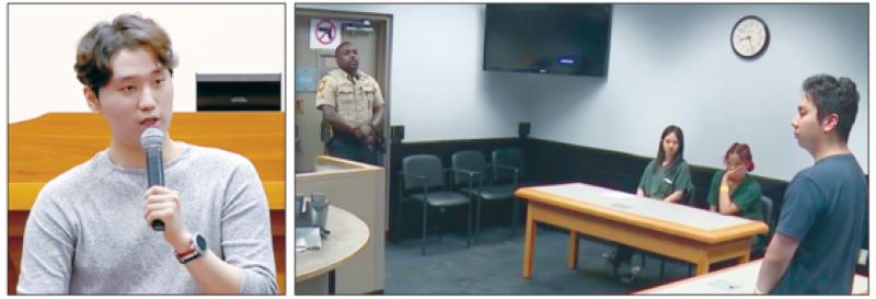 At left, suspect Joonho Lee testifies at a Korean American church in 2019. On September 15, another suspect, Joonhyun Lee, appeared for his initial hearing in Gwinnett County Magistrate Court. [YouTube capture, Fox5 screen capture]