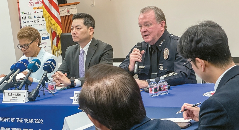 LA Mayor Karen Bass and LAPD Chief Jim McDonnell visited Koreatown on October 9 to meet with Korean American community leaders and discuss key issues including immigration enforcement, homelessness, and local safety concerns. The meeting, organized by the LA Korean American Federation, was held at the federation’s headquarters and attended by Robert Ahn, the federation’s president, along with several major association heads.