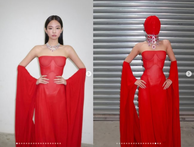 However, her most talked-about moment this year remains the 40th Golden Disc Awards in Taipei. Jennie appeared in a stunning red body-con dress, accentuated by a rubies-and-diamonds necklace valued at a staggering 5.8 billion KRW (approx. $4.3 million USD). While the dress was previously seen on Kim Kardashian in a nude tone, Jennie’s choice of bold red transformed the piece into a viral sensation, proving she doesn’t just follow trends—she reinvents them.