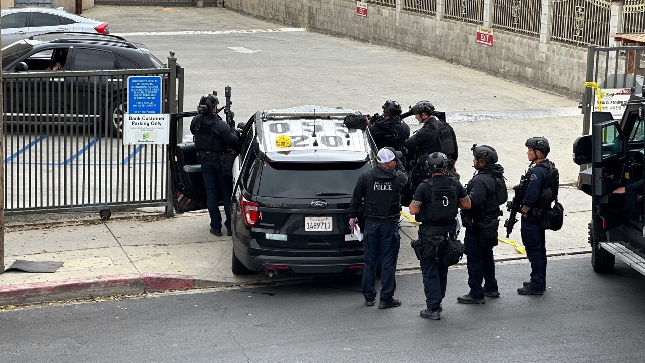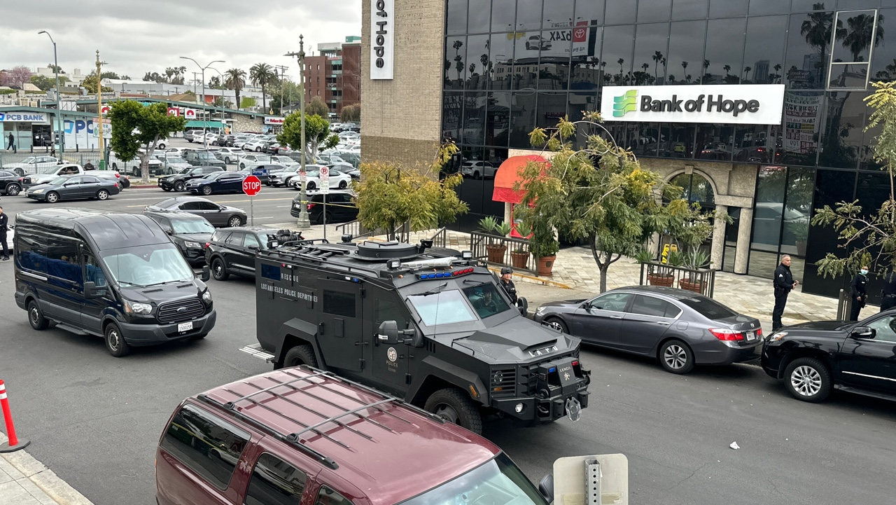 According to the LAPD, the suspect attempted a robbery into the bank branch at the Olympic location around 1:40 p.m. and then got into a vehicle parked behind the building and engaged in a standoff with the police.