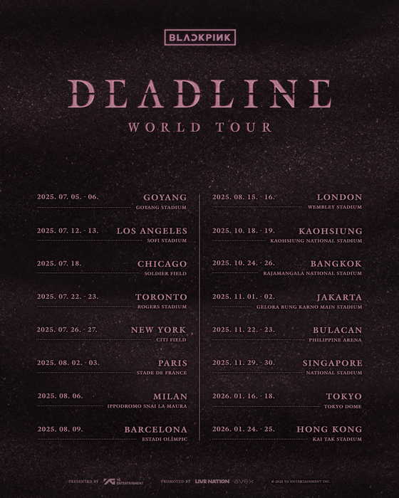 ![Tour dates for Blackpink's upcoming world tour, ″Deadline″ [YG ENTERTAINMENT]](https://spcdn.shortpixel.ai/spio/ret_img,q_cdnize,to_auto,s_webp:avif/en.koreadaily.com/wp-content/uploads/2025/06/0603-Blackpink.jpg)
