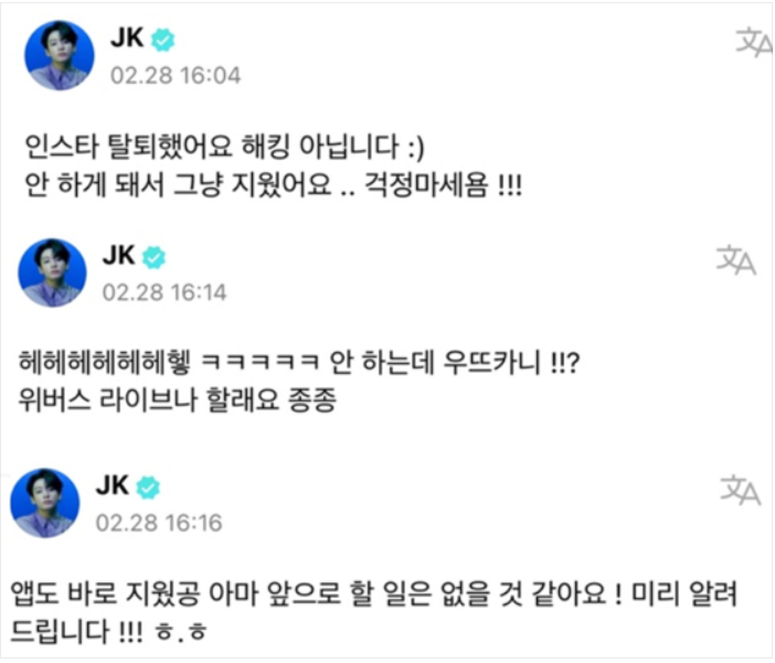 Jungkook wrote three posts on Weverse regarding the deactivation of his Instagram account on Tuesday. [SCREEN CAPTURE]