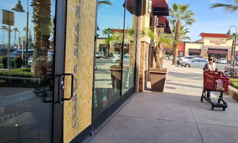 A clothing store at Village Circle on Beach in Buena Park has boarded up its shattered window with plywood after a recent break-in. A string of burglaries at the shopping mall over the past month has left Korean business owners on edge. [Brian Choi, The Korea Daily]