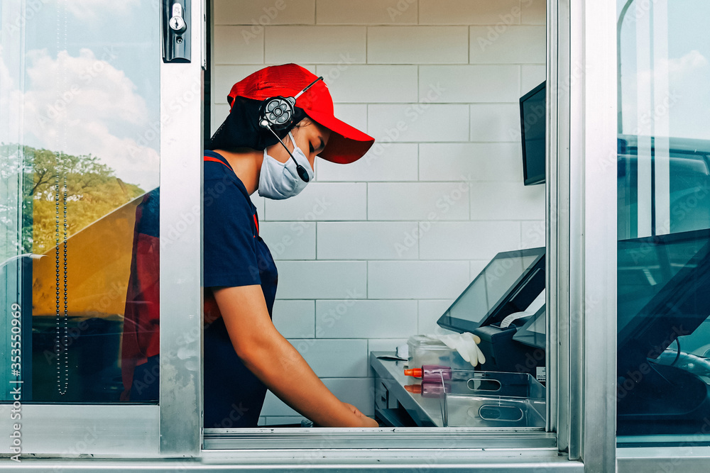 Bangkok, Thailand - May 28, 2020 : fast food cashier in drive thru service wearing hygiene face mask to protect coronavirus pandemic or covid-19 virus outbreak working on counter at the station.