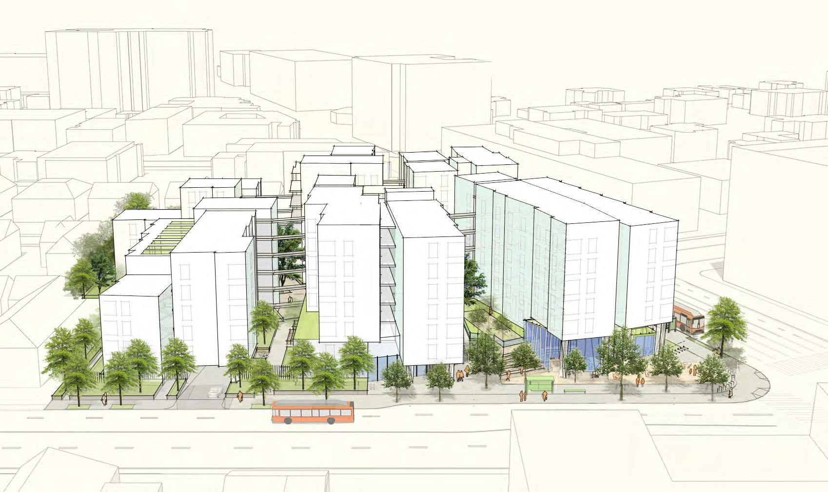 Abode Communities said it plans to preserve existing trees along the southern edge of the site and add new landscaping to create visual separation from nearby single-family homes and multifamily residences. The developer also stated that building spacing, lower-level design, and exterior materials were selected to maintain harmony with the surrounding historic preservation area.