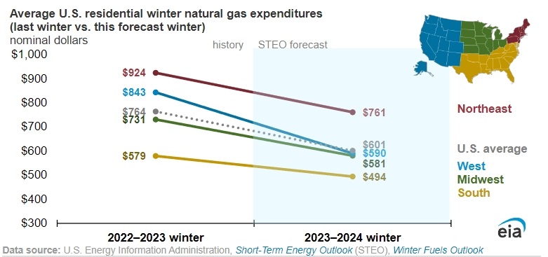 The West region, including California, is projected to see the steepest drop in the country, with average winter natural gas costs expected to decrease from $843 last year to $590 this year.