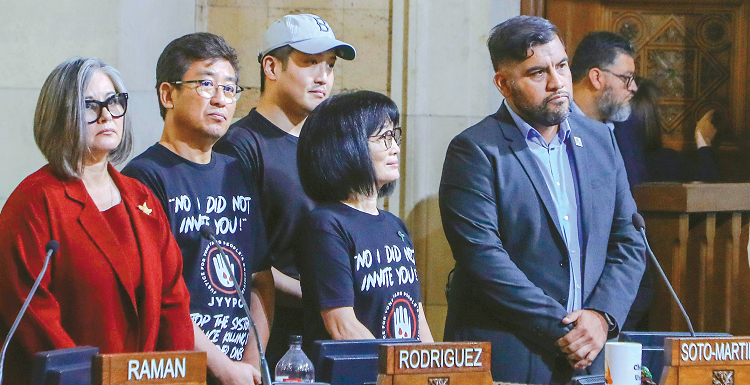 The family of Yong Yang, who was killed by LAPD, and Councilmember Hugo Soto-Martinez watch videos of Yong Yang’s life at the council chamber on September 17. [Sangjin Kim, The Korea Daily]