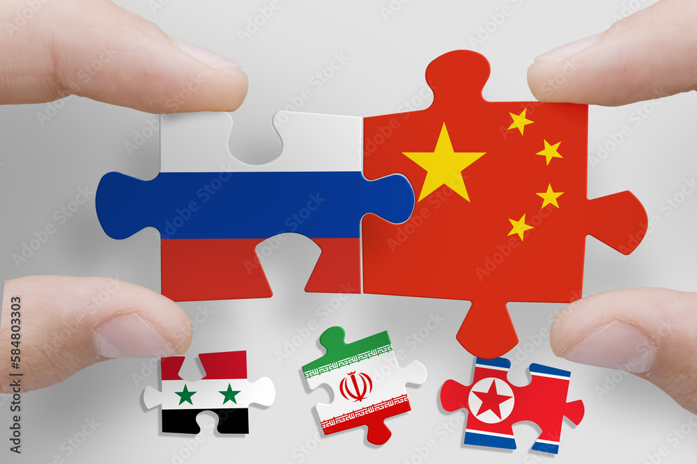 Puzzle made from flags of Russia, China, Syria, Iran and North Korea. Russia and China relations and military collaboration