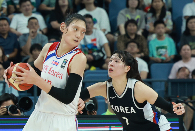 During the women’s basketball match between South Korea and North Korea at the 2022 Hangzhou Asian Games, South Korea’s Park Ji-su (right) lowers her stance to defend against North Korea’s center, Pak Jin-a. [YONHAP]