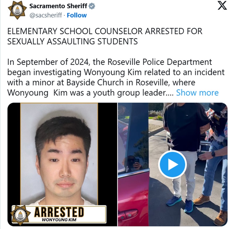 According to the Sheriff’s Office, suspect Kim was caught red-handed in September 2024 for his criminal activities after a 15-year-old girl attending Roseville Bayside Church reported him.