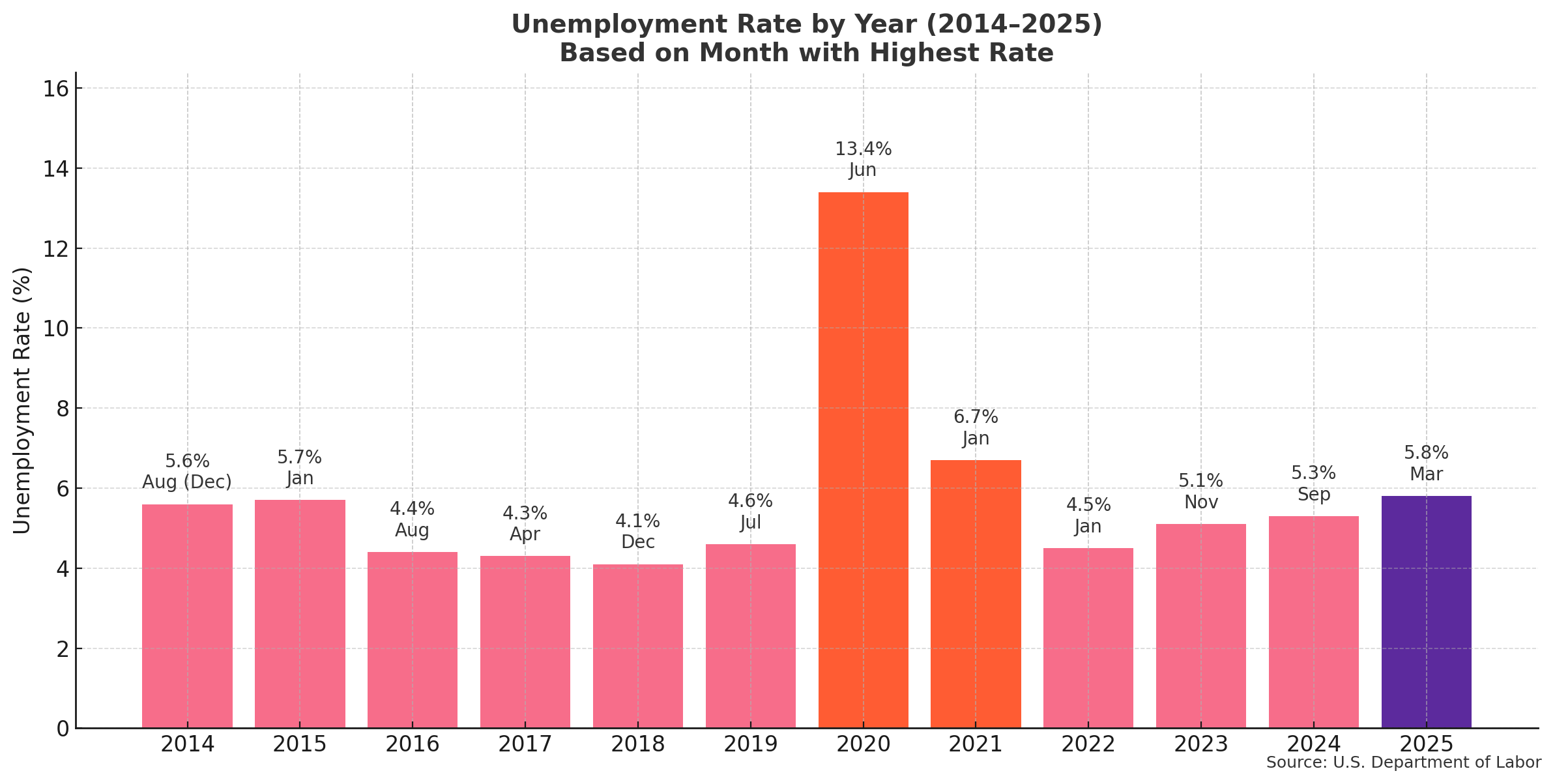 According to the U.S. Department of Labor, the unemployment rate for 22- to 27-year-olds who recently graduated hit 5.8% in March. That’s the highest rate since November 2013, excluding the COVID-19 spike.
