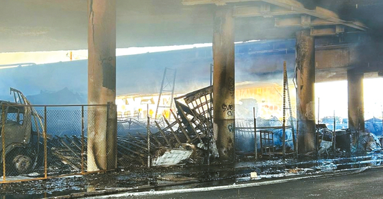 A melted pole under the freeway was seen after a fire on November 11 near the 10 Freeway bridge in downtown Los Angeles. The California Department of Transportation (Caltrans) closed the Alameda-Santa Fe section of the freeway in both directions indefinitely. [Screen captured from KTLA News]