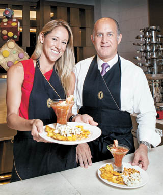 Ecuadorian Ambassador to Korea Oscar Herrera Gilbert, right, and his wife Maria Roura De Herrera serve up freshly made shrimp ceviche at the Grand InterContinental Seoul Parnas in southern Seoul. By Park Sang-moon