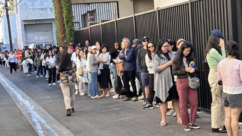 The viral tote bag’s reputation remained strong. On this day, the line outside Trader Joe’s on Fairfax Avenue stood long before the store opened, going well over 500 feet long.