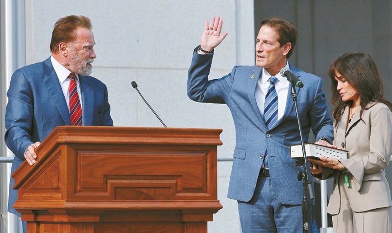 On December 3, newly appointed Los Angeles County District Attorney Nathan Hochman (center) takes the oath of office, administered by former California Governor Arnold Schwarzenegger (left). [REUTERS]