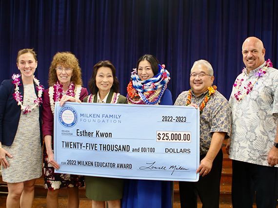 The Milken Educator Awards program, which was launched by the Milken Family Foundation in 1987, has been described as “the Oscars of Teaching” by Teacher magazine. Kwon is the 80th Hawai‘i teacher to receive the award since Hawai‘i joined the program in 1990. Hawai‘i recipients have received awards along with a total of $2 million in prize monies.