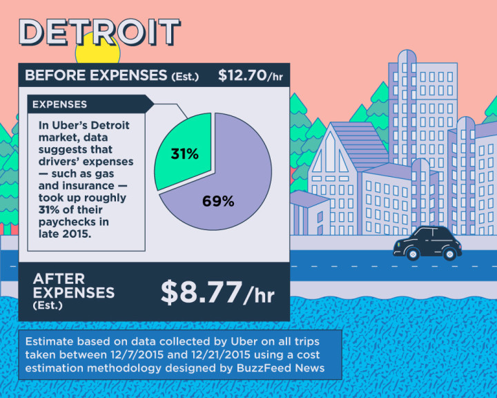 It was estimated that Uber drivers in Detroit earn $8.77 per hour, $10.75 in Houston, and $13.17 in Denver.