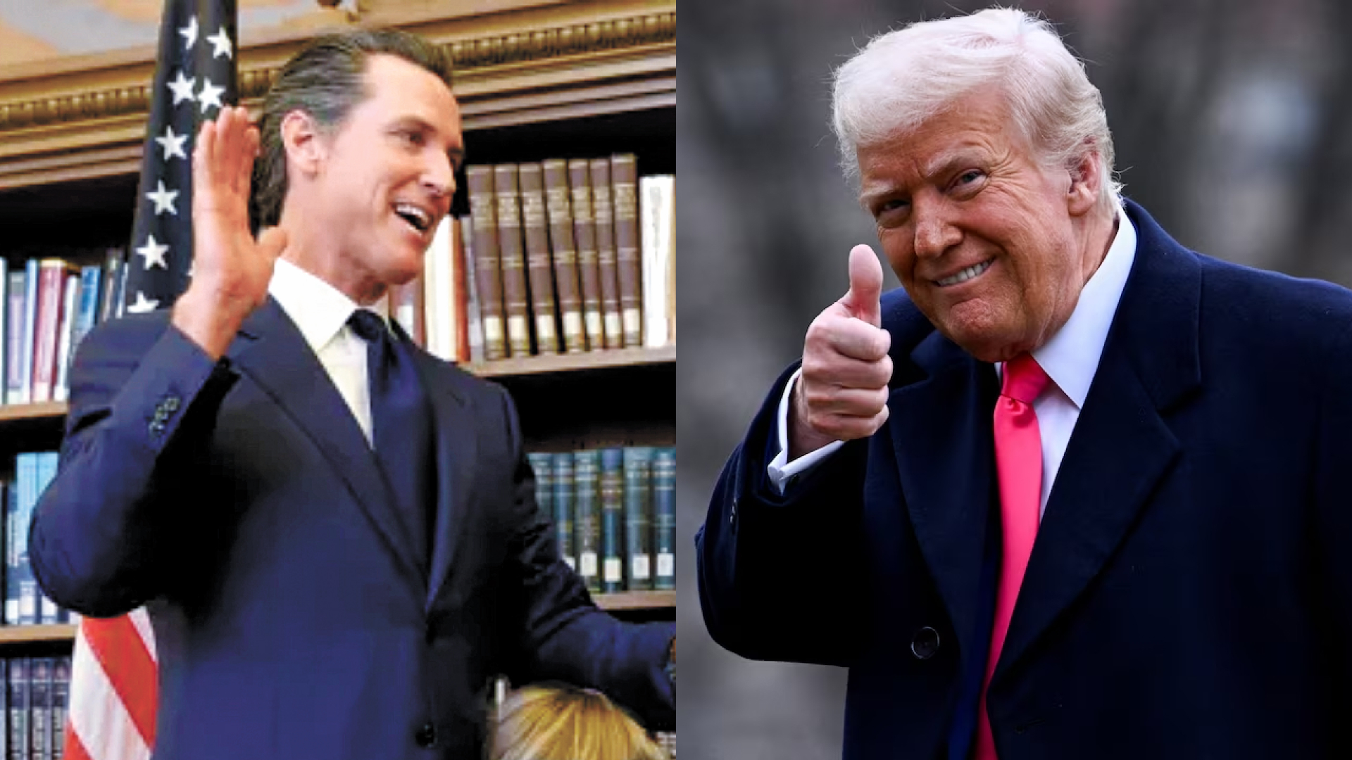 Gavin Newsom and Donald Trump shown side by side amid growing tension over federal election monitors in California.