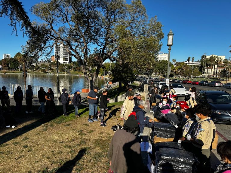 The volunteers gathered at MacArthur Park on December 16, 2024 to hand out winter jackets to those in need. [Sangjin Kim, The Korea Daily]