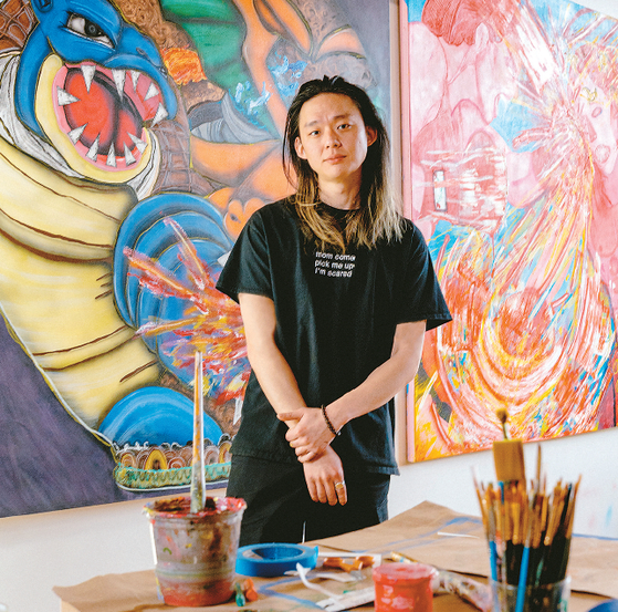 David Heo uses his paintings to convey identity and deliver social messages. He is an emerging artist in the contemporary art industry. Heo at work in his studio. [Courtesy of David Heo].