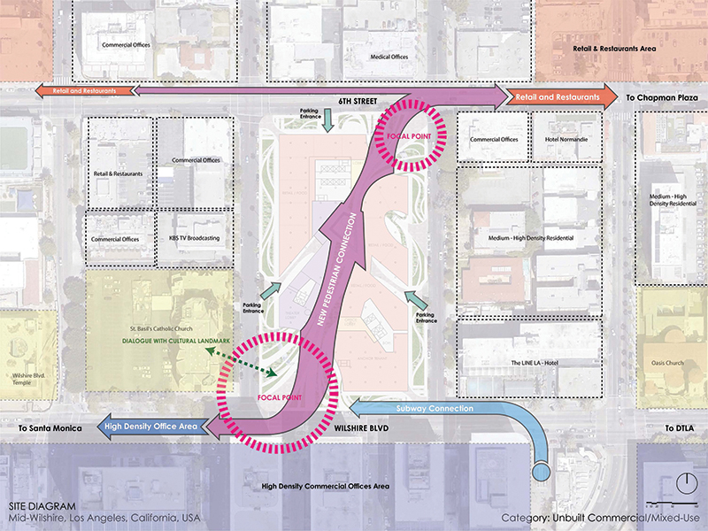 The redevelopment designs for the Consulate General site and the BCD Tofu House site reveal an open layout that allows pedestrians to pass through naturally. Additionally, the pathways connecting Wilshire Boulevard and 6th Street are set at diagonal angles. This diagonal connection is intended to introduce a more engaging walking experience, breaking away from the rigid grid structure of Koreatown and adding an element of exploration.