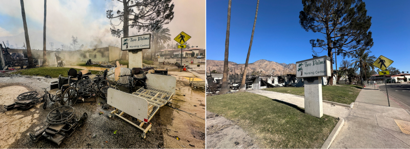 Driving further into Altadena, the destruction grows more apparent. Near Washington Boulevard and Del Rey Avenue stood Two Palms Nursing Center, a home for the elderly. Just six days ago, the area was unbreathable without a mask, engulfed in flames and chaos. Now, the site is a skeletal frame of charred steel, a stark reminder of what was lost. Broken wheelchairs, hospital beds, and splintered wood are strewn across the grounds.