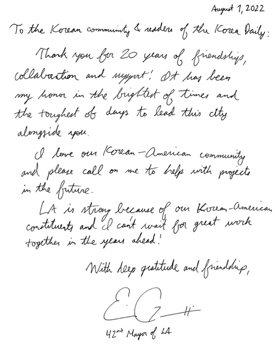 [KD Exclusive Interview] LA Mayor Eric Garcetti… “The vacancy for District 10 is an opportunity to elect the right person who could be a friend and represent Korea Town” By Korea Daily Digital Aug 3, 2022 6:30 PM PDT “The vacancy for District 10 is an opportunity to elect the right person who could be a friend and represent Korea Town” Autograph letter signed by LA mayor Eric Garcetti TagsEric GarcettiExclusive interviewKoreatownKoreatown newsKtownLA cityLA KoreatownLA MayerLos Angeles Share FacebookXPinterestWhatsApp Elevated Chinese Cuisine in ROW DTLA for AAPI Month Apr 24, 2026 5:13 PM PDT His first South Korea experience! Apr 24, 2026 3:15 PM PDT Faith Meets Housing: 155 New Affordable Units for University Park Apr 24, 2026 3:12 PM PDT The WONDERfools is coming May 15, only on Netflix Apr 24, 2026 3:12 PM PDT Load more