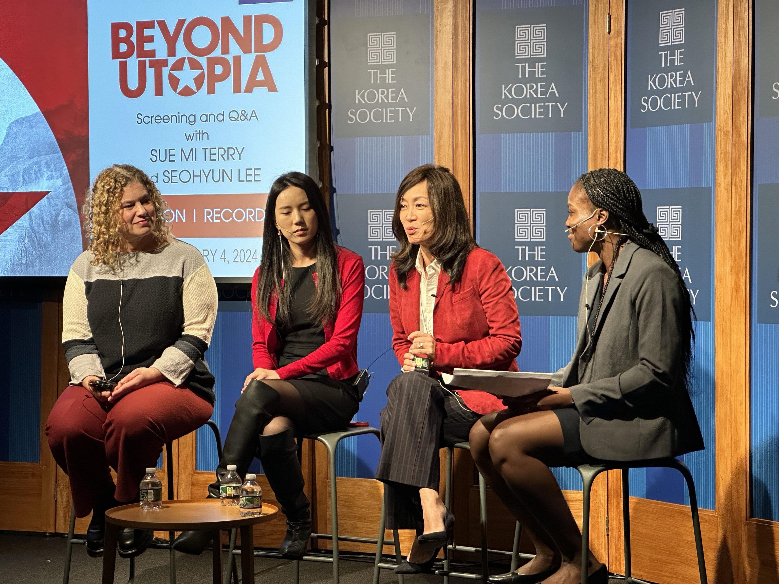 Sue Mi Terry, second from the right, speaks at the screening of the documentary film “Beyond Utopia” during an event hosted by the Korea Society in New York on January 4. [YONHAP]