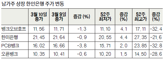 Bank of Hope, Hanmi Bank, PCB Bank, and Open Bank, the four largest publicly traded Korean American banks in Southern California, all hit new 52-week lows.