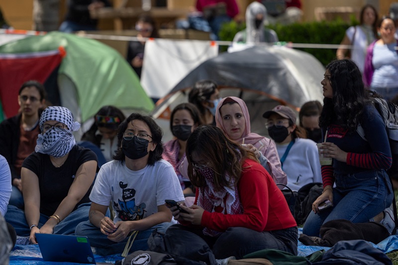 Students listen to a speech at a protest encampment in support of Palestinians at Stanford University during the ongoing conflict between Israel and the Palestinian Islamist group Hamas, in Stanford, California U.S., April 26, 2024. [REUTERS]