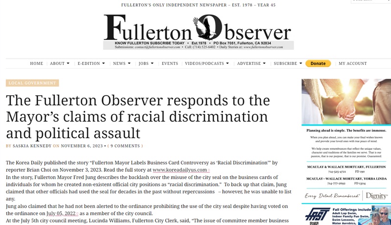 Fullerton Mayor Fred Jung, who faced criticism from the Fullerton Observer — a local newspaper that accused him of improperly allowing the city seal on business cards for individuals in non-existent official city positions without authorization — has become embroiled in a second dispute following an article published by the Korea Daily on November 3 at www.koreadailyus.com.