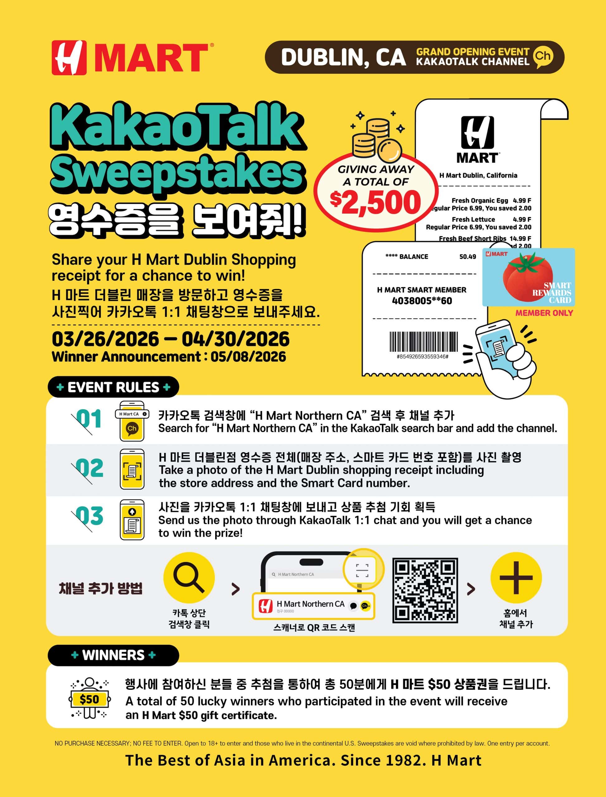 Winners will be notified individually, and the official “Wall of Fame” will be posted on the H Mart website on May 8, 2026.