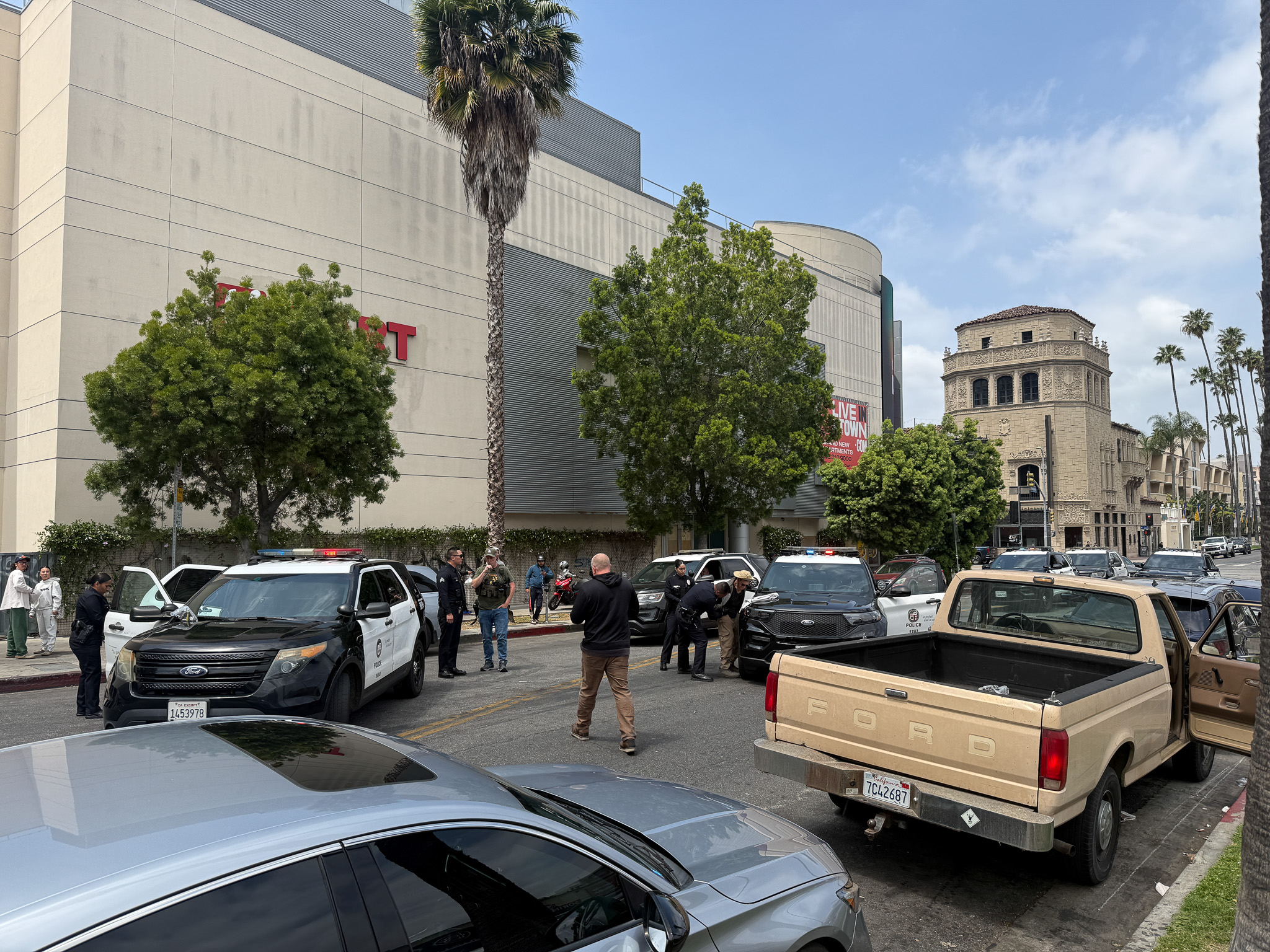 At least six police vehicles responded to the scene, creating a visible law enforcement presence in the busy shopping area and drawing attention from nearby pedestrians.
